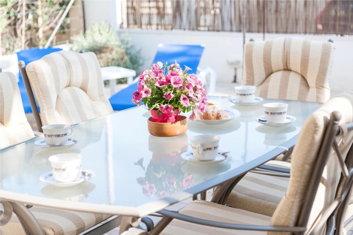 Casa de 3 dormitorios. La casa presenta una decoración que combina los estilos clásico y colonial y cuenta con terraza amplia con zona de comedor al aire libre y barbacoa. La entrada principal da a la sala de estar con chimenea, mientras que la entrada trasera da a la terraza y a la cocina bien equipada. Incluye lavadora y utensilios de planchado. La 1.ª planta dispone de 3 dormitorios y 2 baños. El dormitorio doble principal tiene aire acondicionado y baño. También hay 1 dormitorio con 2 camas individuales y 1 dormitorio con literas. En la terraza delantera hay zona de relajación con sofá y sillones cómodos. La terraza trasera tiene porche y está amueblada con mesa y 6 sillas.