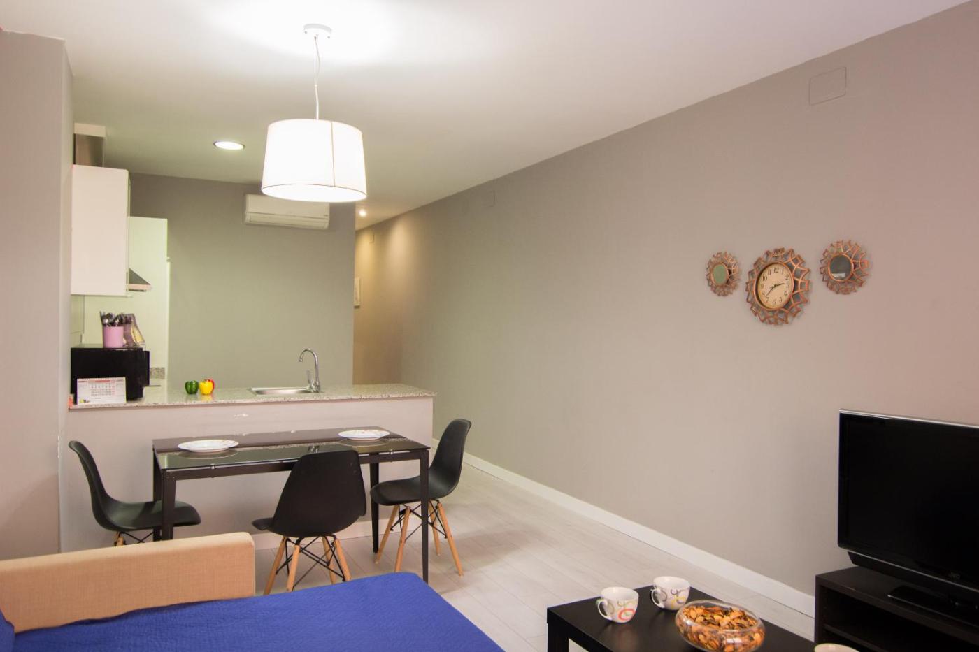 Apartamento de 1 dormitorio. Boasting a private entrance, this air-conditioned apartment comes with 1 living room, 1 separate bedroom and 1 bathroom with a shower and a hairdryer. The well-equipped kitchen has a stovetop, a refrigerator, kitchenware and an oven. The apartment features parquet floors, a seating area with a flat-screen TV, a washing machine, a dining area, as well as a wardrobe. The unit has 2 beds. ;